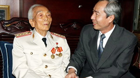Ngày 9/2, Trưởng Ban Tuyên giáo Trung ương Tô Huy Rứa chúc Đại tướng Võ Nguyên Giáp sức khỏe, trường thọ, minh mẫn.