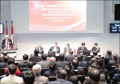 Tiếp tục chuyến thăm chính thức Liên bang Thụy Sĩ, chiều 17/5 (theo giờ Hà Nội), tại thành phố Zurich - trung tâm tài chính lớn của Thụy Sĩ và châu Âu, Chủ tịch nước Nguyễn Minh Triết tới dự và phát biểu tại Diễn đàn Doanh nghiệp Việt Nam - Thụy Sĩ. Cùng dự có Phó Thủ tướng, Bộ trưởng Bộ Ngoại giao Phạm Gia Khiêm.