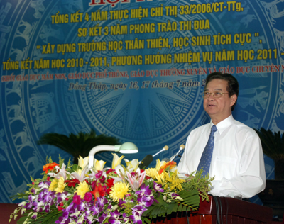Thủ tướng Nguyễn Tấn Dũng đã dự Hội nghị Tổng kết 4 năm thực hiện Chỉ thị 33/2006/CT-TTg, sơ kết 3 năm phong trào thi đua “Xây dựng trường học thân thiện, học sinh tích cực” và tổng kết năm học 2010-2011 do Bộ Giáo dục và Đào tạo tổ chức tại Cao Lãnh, Đồng Tháp ngày 16/7.