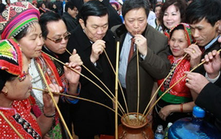Đến thăm khu các làng dân tộc, Chủ tịch nước Trương Tấn Sang đã chứng kiến nghi lễ xuống đồng; vui chung cùng đồng bào dân tộc Thái, Nùng, Mông trong các lễ hội mừng năm mới.