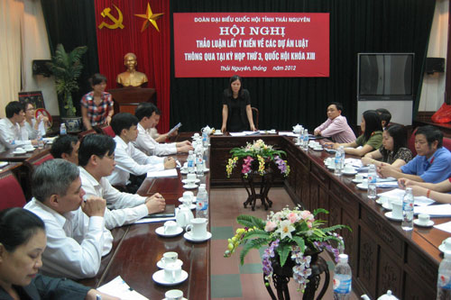 Ngày 6-4, Đoàn đại biểu Quốc hội (ĐBQH) tỉnh Thái Nguyên đã tổ chức họp với đại diện các cơ quan chức năng để lấy ý kiến tham gia vào dự thảo Luật xử lý vi phạm hành chính (VPHC) để trình tại Kỳ họp thứ 3, Quốc hội (QH) khóa XIII. Đồng chí Lê Thị Nga, Phó Chủ nhiệm ủy ban Tư pháp QH, Đoàn ĐBQH tỉnh chủ trì cuộc họp (anh).