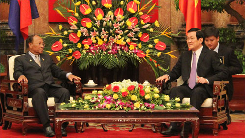 Tại buổi tiếp, Chủ tịch nước Trương Tấn Sang bày tỏ vui mừng được tiếp Chủ tịch Quốc hội Capuchia Samdech Heng Samrin sang thăm Việt Nam đúng dịp 2 nước đang kỷ niệm “Năm Hữu nghị Việt Nam - Campuchia 2012 và kỷ niệm 45 năm thiết lập quan hệ ngoại giao hai nước”.