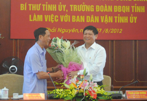 Tại buổi gặp mặt, Ban Dân vận Tỉnh ủy đã báo cáo với đồng chí Bí thư Tỉnh ủy về cơ cấu tổ chức và hoạt động của công tác dân vận trong thời gian qua. Theo đó, Ban hiện 4 phòng nghiệp vụ với 17 cán bộ, trong đó 15 người có trình độ đại học và trên đại học, 4 người có trình độ cao cấp và cử nhân lý luận chính trị. Trong thời gian qua, Ban Dân vận Tỉnh ủy đã thực hiện tốt 2 Đề án là: Đề án số 04-ĐA/TU tháng 5-2011 về “Tiếp tục đổi mới công tác dân vận của hệ thống chính trị, nâng cao chất lượng, hiệu quả của MTTQ và các đoàn thể nhân dân giai đoạn 2011 - 2015” và Đề án số 08-ĐA/TU tháng 8-2011 về “Nâng cao chất lượng, hiệu quả thực hiện quy chế dân chủ ở cở sở giai đoạn 2011-2015”. Hoạt động của Ban dân vận các cấp tập trung tuyên truyền các chủ trương, chính sách của Đảng, pháp luật của Nhà nước, đặc biệt là việc triển khai thực hiện Nghị quyết Trung ương 4 (khóa XI), gắn với đẩy mạnh học tập và làm theo tấm gương đạo đức Hồ Chí Minh. Ban Dân vận Tỉnh ủy đề nghị Thường trực Tỉnh ủy tạo điều kiện tăng số biên chế để kiện toàn bộ máy; tăng cường công tác luân chuyển cán bộ và chỉ đạo của cấp ủy Đảng với công tác dân vận các cấp…