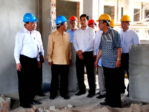 Báo cáo tiến độ công trình, ông Phí Văn Mai, đại diện Công ty Trách nhiệm hữu hạn hợp tác quốc tế Quân khu 2 cho biết tổng giá trị dự án là 56 tỷ đồng, được khởi công ngày 15/11/2011, đáp ứng cho 560 học sinh.