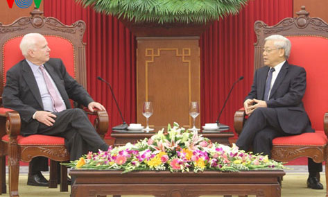 Tổng Bí thư Nguyễn Phú Trọng hoan nghênh Thượng nghị sỹĩ John McCain và Thượng Nghị sĩ Sheldon Whitehouse trở lại thăm Việt Nam, đánh giá cao những tình cảm và đóng góp của cá nhân hai Thượng nghị sĩ và nhiều bạn bè Hoa Kỳ trong quan hệ với Việt Nam, bày tỏ hài lòng về những bước phát triển tích cực trong quan hệ hợp tác nhiều mặt giữa hai nước, nhất là trong vòng một năm qua từ khi khuôn khổ quan hệ Đối tác Toàn diện được thiết lập.