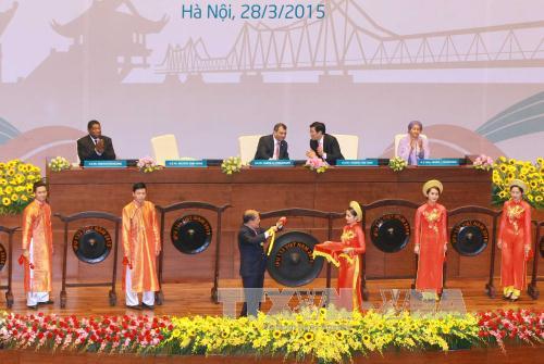 Kết thúc bài phát biểu, Chủ tịch Quốc hội Nguyễn Sinh Hùng đã trang trọng đánh một hồi chiêng, chính thức khai mạc Đại hội đồng IPU-132.