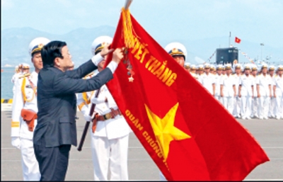 Chủ tịch nước Trương Tấn Sang trân trọng gắn danh hiệu Anh hùng LLVTND lên lá cờ truyền thống của QCHQND Việt Nam và phát biểu ý kiến nhấn mạnh: Ðảng, Nhà nước và nhân dân ta rất đỗi tự hào về truyền thống vẻ vang của QCHQND Việt Nam Anh hùng. Trải qua 60 năm xây dựng, chiến đấu và trưởng thành, các thế hệ chiến sĩ Hải quân đã vượt qua muôn ngàn khó khăn, thử thách, hoàn thành thắng lợi mọi nhiệm vụ, lập nhiều chiến công hiển hách trong các cuộc chiến tranh giải phóng, chiến tranh bảo vệ Tổ quốc; và trong sự nghiệp xây dựng và bảo vệ Tổ quốc Việt Nam XHCN. Chủ tịch nước nhấn mạnh: Trong những năm tới tình hình thế giới và khu vực sẽ còn nhiều diễn biến phức tạp, tranh chấp lãnh thổ, chủ quyền biển, đảo trên Biển Ðông tiếp tục diễn ra gay gắt. Bảo vệ chủ quyền biển, đảo của Tổ quốc đang đứng trước nhiều khó khăn, thách thức to lớn và nghiêm trọng,... Quân chủng Hải quân cần phát huy mạnh mẽ truyền thống 60 năm qua để thực hiện tốt các nhiệm vụ: Quán triệt sâu sắc quan điểm của Ðảng, Nhà nước về nhiệm vụ bảo vệ Tổ quốc, bảo vệ chủ quyền biển, đảo và giải quyết các tranh chấp trên Biển Ðông. Phát huy cao độ ý chí tự lực, tự cường xây dựng HQND Việt Nam cách mạng, chính quy, tinh nhuệ, hiện đại. Ðổi mới, nâng cao chất lượng huấn luyện, sẵn sàng cơ động, nâng cao khả năng quản lý, bảo vệ chủ quyền biển, đảo của Tổ quốc. Xây dựng nền quốc phòng toàn dân, xây dựng thế trận chiến tranh nhân dân trên biển vững chắc, trong đó, HQND Việt Nam luôn là lực lượng nòng cốt. Tiếp tục xây dựng Ðảng bộ Quân chủng Hải quân trong sạch, vững mạnh, nâng cao năng lực lãnh đạo, sức chiến đấu của tổ chức đảng trong toàn Ðảng bộ. Chủ tịch nước Trương Tấn Sang tin tưởng Quân chủng HQND Anh hùng nhất định sẽ hoàn thành xuất sắc mọi nhiệm vụ, xứng đáng là lực lượng nòng cốt bảo vệ vững chắc chủ quyền biển, đảo, thềm lục địa thiêng liêng của Tổ quốc.