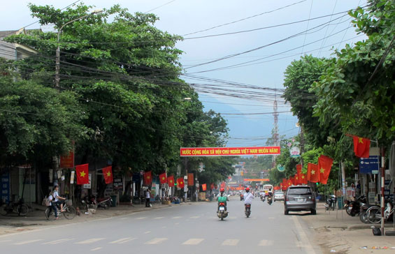 Trung tâm thị trấn Hùng Sơn được trang trí cờ hoa, băng zôn cổ động rực rỡ.