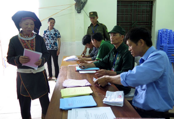 Cử tri xóm Ba Nhất (100% đồng bào dân tộc Dao), xã Phú Thượng nhận phiếu từ thành viên Tổ bầu cử để bỏ phiếu bầu.