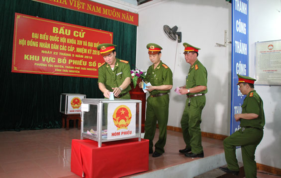 Các cử tri là cán bộ, chiến sĩ công an tham gia bỏ phiếu tại khu vực bỏ phiếu số 6 phường Túc Duyên, T.P Thái Nguyên.