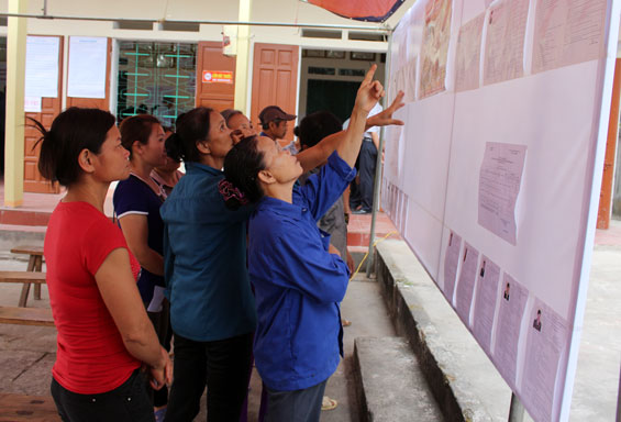 Các cử tri xóm Bò 1, xã Phấn Mễ nghiên cứu tiểu sử các ứng cử viên trước khi bỏ phiếu