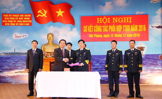 Ngày 12-12, tại T.P Hải Phòng, Cục Kỹ thuật, Bộ Tư lệnh Hải Quân đã phối hợp với Ban Tuyên giáo Tỉnh ủy các tỉnh: Bắc Ninh, Thái Nguyên, Bắc Kạn tổ chức Hội nghị Sơ kết thực hiện công tác phối hợp tuyên truyền biển đảo (TTBĐ) năm 2016 và ký kết chương trình phối hợp TTBĐ năm 2017.