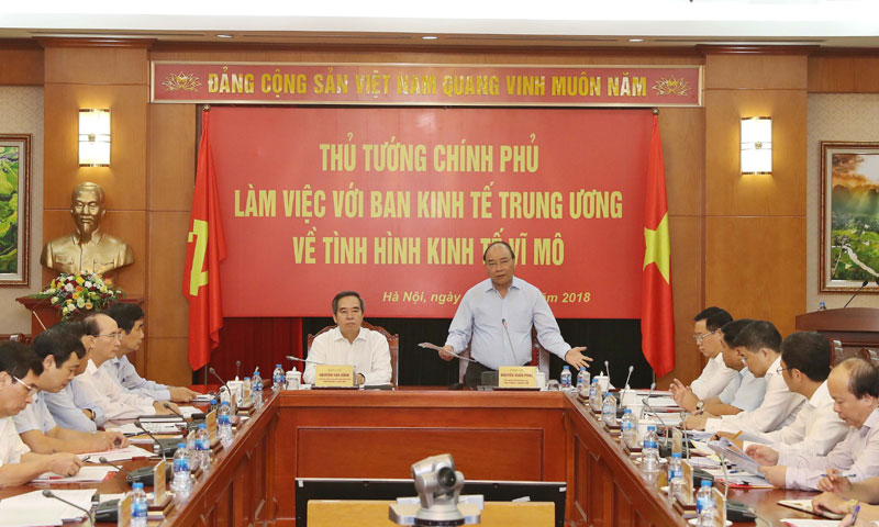 Thực hiện quy chế phối hợp công tác giữa Ban Cán sự đảng Chính phủ và Ban Kinh tế Trung ương, chiều 23-7, tại Hà Nội, Ủy viên Bộ Chính trị, Bí thư Ban Cán sự đảng Chính phủ, Thủ tướng Chính phủ Nguyễn Xuân Phúc và Ủy viên Bộ Chính trị, Bí thư Trung ương Đảng, Trưởng ban Kinh tế Trung ương Nguyễn Văn Bình đồng chủ trì buổi làm việc giữa hai cơ quan về tình hình kinh tế vĩ mô của Việt Nam trong 6 tháng đầu năm 2018 và trao đổi một số chính sách, giải pháp lớn nhằm bảo đảm ổn định kinh tế vĩ mô, thúc đẩy tăng trưởng kinh tế nhanh, bền vững.