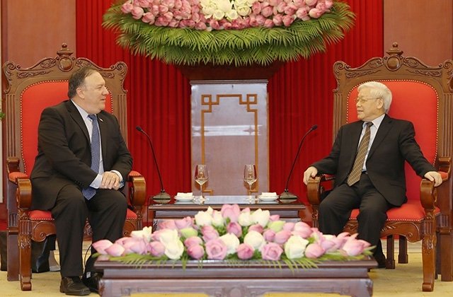Tổng Bí thư Nguyễn Phú Trọng hoan nghênh và đánh giá cao ý nghĩa chuyến thăm Việt Nam của Bộ trưởng Ngoại giao M.Pom-peo trong bối cảnh hai nước có những bước phát triển tốt đẹp trong quan hệ hợp tác nhiều mặt thời gian qua. Tổng Bí thư bày tỏ tin tưởng rằng, chuyến thăm sẽ góp phần tích cực thúc đẩy việc triển khai các thỏa thuận cấp cao giữa hai nước; đề nghị hai bên tiếp tục tăng cường trao đổi đoàn các cấp, đẩy mạnh và nâng cao hiệu quả hợp tác trên các lĩnh vực, tăng cường hợp tác khắc phục hậu quả chiến tranh…, qua đó tích cực xây dựng lòng tin, sự hiểu biết lẫn nhau. Tổng Bí thư khẳng định, chủ trương nhất quán của Đảng và Nhà nước Việt Nam coi trọng quan hệ với Hoa Kỳ; tin tưởng rằng quan hệ Đối tác toàn diện Việt Nam - Hoa Kỳ sẽ tiếp tục phát triển ngày càng tốt đẹp trong thời gian tới, vì lợi ích của nhân dân hai nước, vì hòa bình, ổn định, phát triển trong khu vực và trên thế giới.