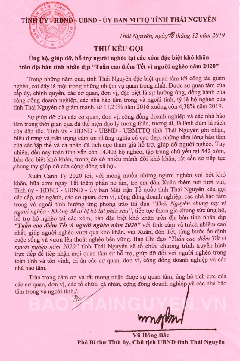 Ngày 18/12, Tỉnh ủy - HĐND - UBND - Ủy ban MTTQ tỉnh Thái Nguyên đã ban hành Thư kêu gọi ủng hộ, giúp đỡ, hỗ trợ người nghèo tại các xóm đặc biệt khó khăn trên địa bàn tỉnh nhân dịp "Tuần cao điểm Tết vì người nghèo năm 2020". Dưới đây là toàn văn Thư kêu gọi: