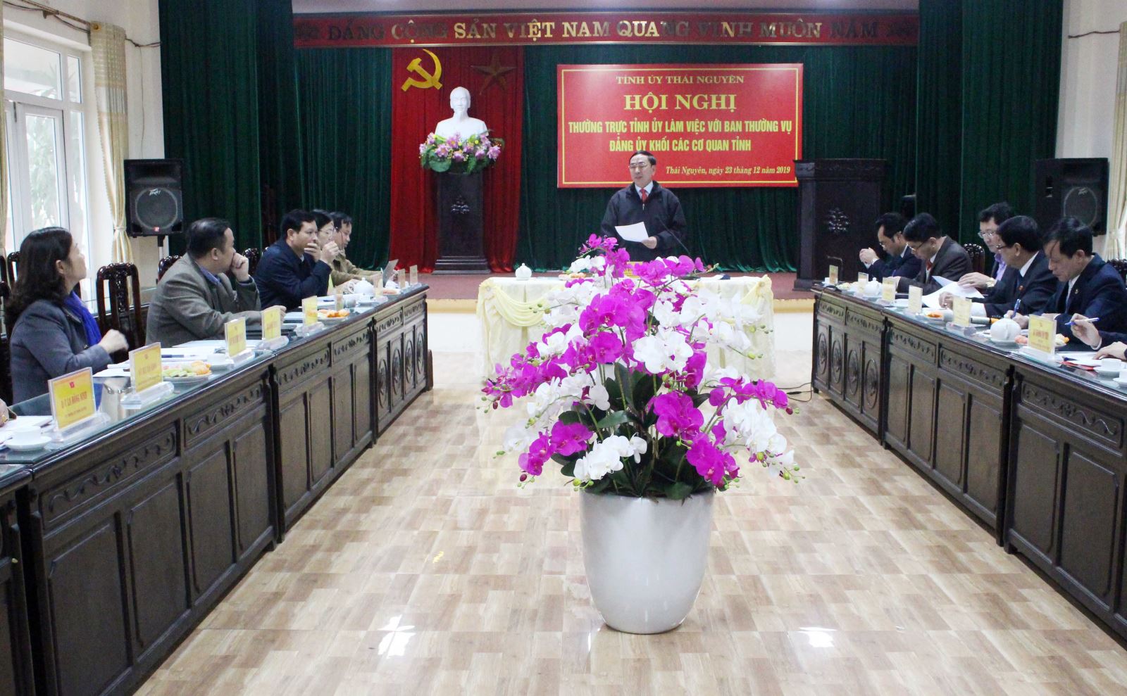 Ngày 23-12, Thường trực Tỉnh ủy đã tổ chức Hội nghị làm việc với Đảng ủy Khối các cơ quan tỉnh về tình hình, kết quả thực hiện nhiệm vụ chính trị giai đoạn 2015-2020 và công tác chuẩn bị Đại hội Đại biểu Đảng bộ Khối các cơ quan tỉnh nhiệm kỳ 2020-2025. Đồng chí Trần Quốc Tỏ, Ủy viên Ban Chấp hành Trung ương Đảng, Bí thư Tỉnh ủy, Trưởng Đoàn đại biểu Quốc hội tỉnh chủ trì Hội nghị. Tham gia Hội nghị có đồng chí Hoàng Công Hà, Phó Vụ trưởng Ban Tổ chức Trung ương; Trần Thị Thúy Nga, Phó Vụ trưởng Vụ địa phương II, Ủy ban Kiểm tra Trung ương; đồng chí Trịnh Việt Hùng, Ủy viên Ban Thường vụ Tỉnh ủy, Phó Chủ tịch UBND tỉnh, đại diện các ban xây dựng Đảng của Tỉnh ủy.