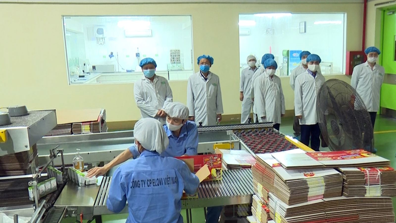 Cũng trong chương trình làm việc, Đoàn công tác cũng đã đi kiểm tra thực tế tại Công ty cổ phần ELovi Việt Nam ở Khu công nghiệp Nam Phổ Yên - đơn vị chuyên sản xuất sữa (ảnh). Tại đây, Công ty đã chấp hành tốt các quy định về phòng chống dịch COVID-19 cho người lao động như: Yêu cầu đeo khẩu trang, đo thân nhiệt khi vào làm việc và thực hiện bố trí, sắp xếp lại vị trí làm việc bảo đảm khoảng cách tối thiểu 2 mét/người.