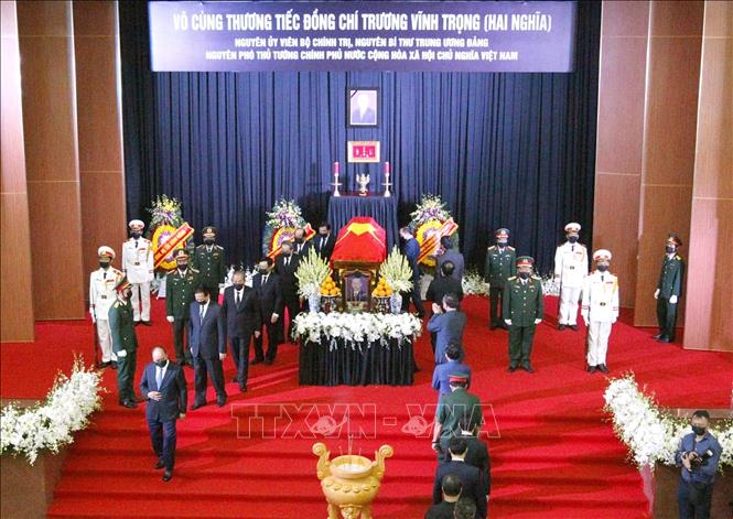 Sáng 21-2, tại Hội trường lớn UBND tỉnh Bến Tre và Nhà tang lễ quốc gia - số 5 Trần Thánh Tông (Hà Nội), Ban Chấp hành Trung ương Đảng, Quốc hội, Chủ tịch nước, Chính phủ, Ủy ban Trung ương Mặt trận Tổ quốc Việt Nam, Tỉnh ủy - HĐND - UBND - Ủy ban Mặt trận Tổ quốc Việt Nam tỉnh Bến Tre và gia đình đã tổ chức trọng thể Lễ viếng đồng chí Trương Vĩnh Trọng, nguyên Ủy viên Bộ Chính trị, nguyên Phó Thủ tướng Chính phủ, nguyên Trưởng ban Nội chính Trung ương theo nghi thức Lễ tang cấp Nhà nước.