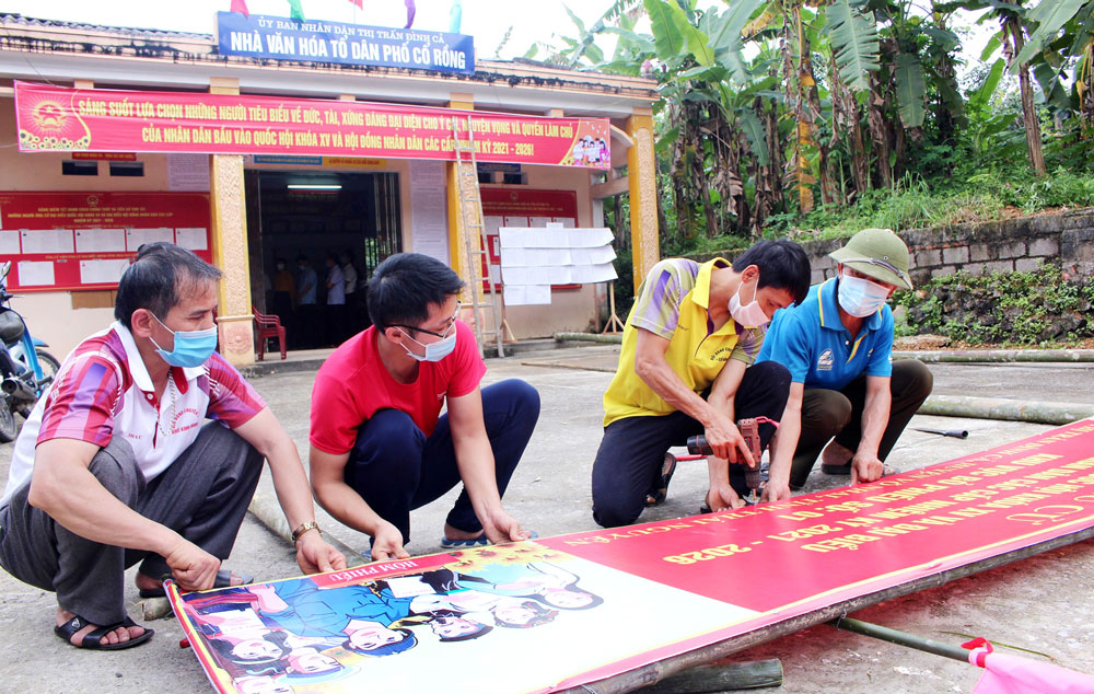 Người dân tổ dân phố Cổ Rồng, thuộc tổ bầu cử số 1, thị trấn Đình Cả (Võ Nhai) tham gia trang hoàng điểm bỏ phiếu tại Nhà văn hóa.
