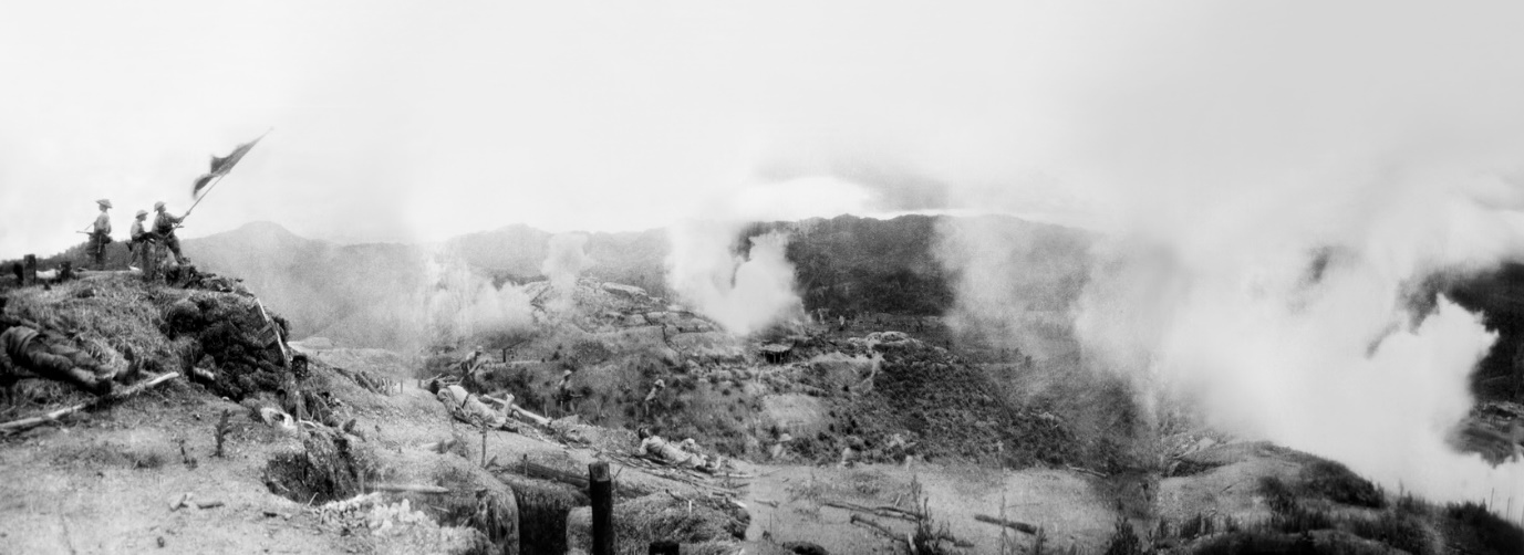 Ảnh 2: Toàn cảnh chiến thắng Him Lam. chụp trực tiếp, nối ghép bằng hai phim quét ngang, (Máy ảnh năm đó còn thô sơ, không thể chụp toàn cảnh (panorama), khi đứng gần đối tượng bằng một lần bấm máy. Bấm máy 2 lần thu được toàn cảnh khu vực trận địa, ghép không lệch... đấy là sự sáng tạo của nhà nhiếp ảnh tài ba gặp khó về kỹ thuật, nhưng lại may mắn chớp được khoảnh khắc có một không hai.