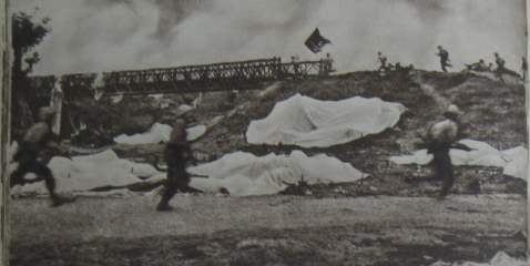 Ảnh 3: Bức ảnh này được chụp lại từ Báo Hình ảnh Việt Nam số 02, tháng 12/1954. Ảnh cho thấy khu vực cầu Mường Thanh còn ngổn ngang dù trắng của phía quân đội Pháp phủ dưới chân cầu. Bộ đội ta đang cấp tập từ chân cầu lên mặt đường, vượt cầu để đánh vào trung tâm.