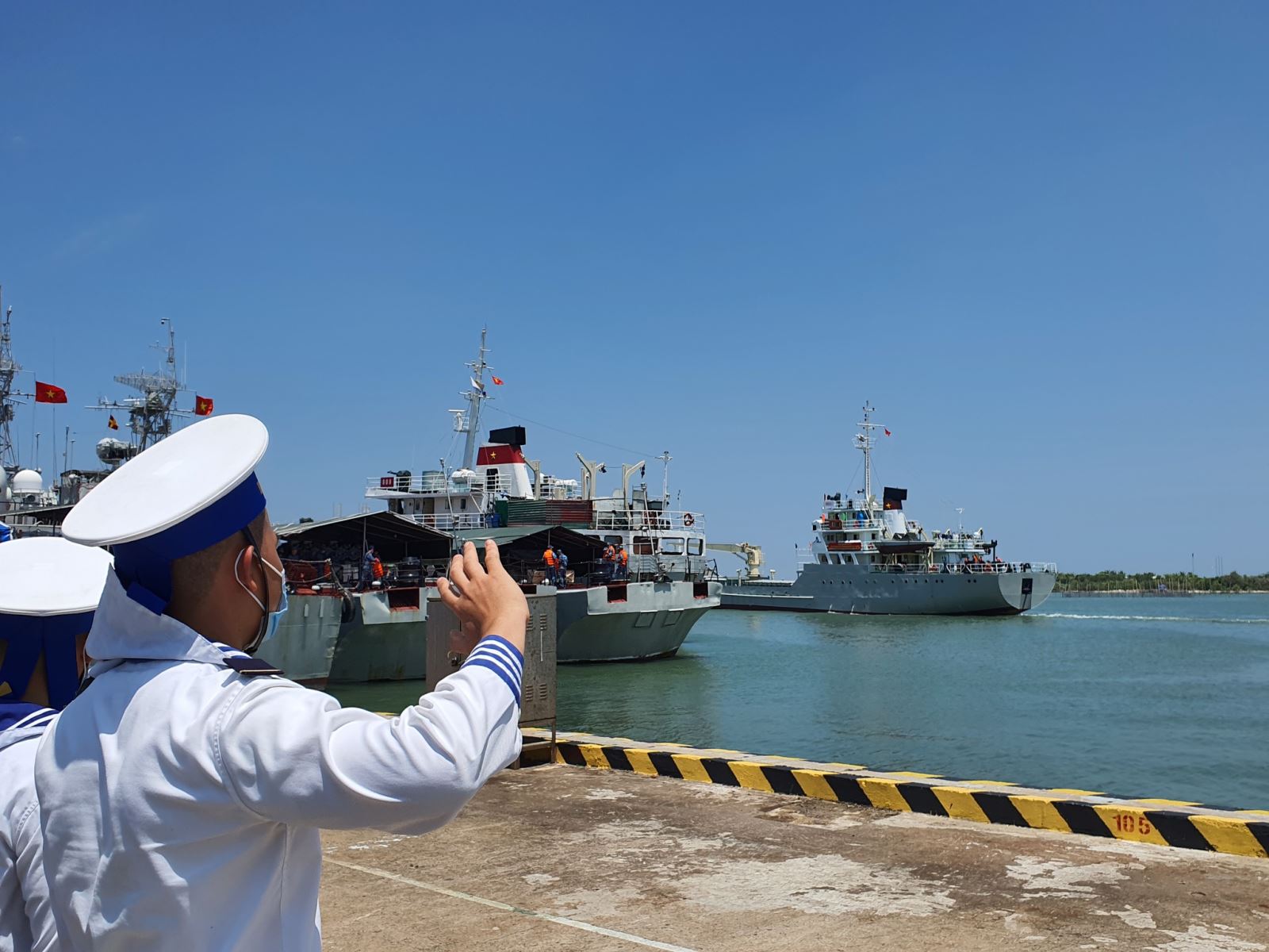 Các chiến sĩ tiễn đưa tàu Trường Sa 04 và Trường Sa 19 đi làm nhiệm vụ. Ảnh: Nguyễn Long