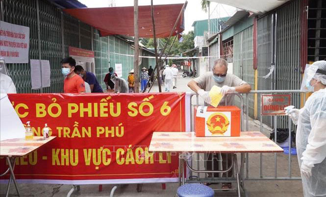 Cử tri đi bầu cử tại khu vực phong tỏa Gốc Mít, phường Trần Phú, thành phố Hải Dương. Ảnh: TTXVN