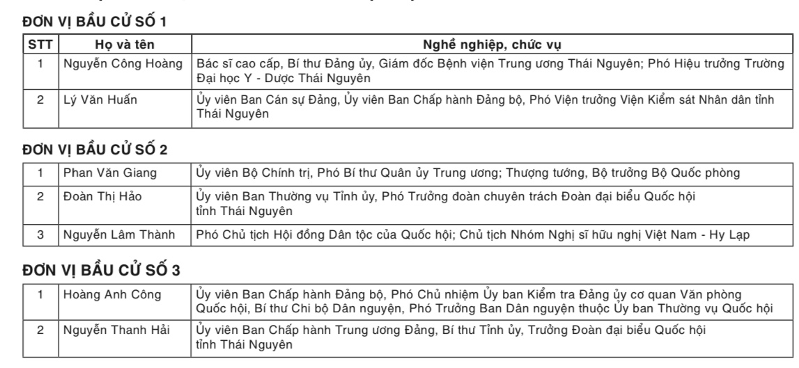 Chiều 10-6, thay mặt Hội đồng Bầu cử Quốc gia, Chủ tịch Hội đồng Bầu cử Quốc gia, Chủ tịch Quốc hội Vương Đình Huệ đã ký Nghị quyết số 748/NQ-HĐBCQG của Hội đồng Bầu cử Quốc gia về việc công bố kết quả bầu cử và danh sách những người trúng cử đại biểu Quốc hội khóa XV. Báo Thái Nguyên Điện tử đăng danh sách 7 người trúng cử đại biểu Quốc hội khóa XV tại 3 đơn vị bầu cử trên địa bàn tỉnh (xếp theo vần A - B - C và theo thứ tự đơn vị bầu cử).