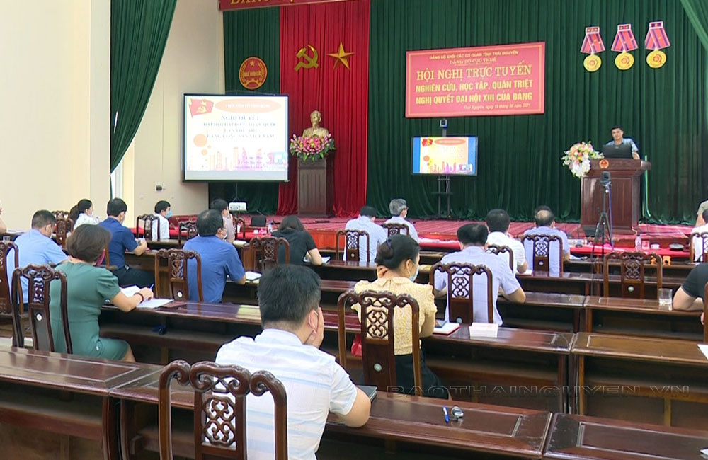 Ngày 19-6, Đảng ủy Cục thuế tỉnh đã tổ chức Hội nghị trực tuyến nghiên cứu, học tập, quán triệt, tuyên truyền Nghị quyết Đại hội đại biểu toàn quốc lần thứ XIII của Đảng. Hội nghị được kết nối với 6 điểm cầu chi cục thuế khu vực các huyện, thành phố, thị xã trên địa bàn tỉnh. Đồng chí Vũ Duy Hoàng, Ủy viên Ban Thường vụ, Trưởng Ban Tuyên giáo Tỉnh ủy dự và trực tiếp truyền đạt các nội dung. Hội nghị thực hiện các biện pháp phòng, chống COVID-19 theo đúng quy định của Bộ Y tế (ảnh).