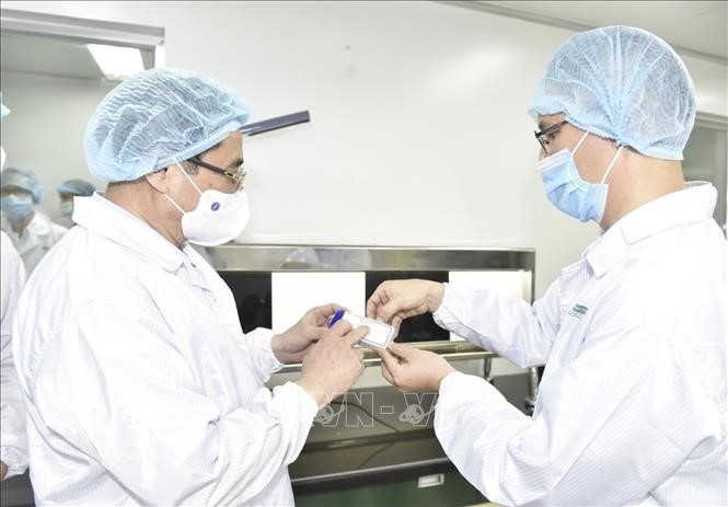 Thủ tướng Phạm Minh Chính thăm Công ty TNHH MTV Vaccine và Sinh phẩm số 1 (VABIOTECH). Ảnh: TTXVN