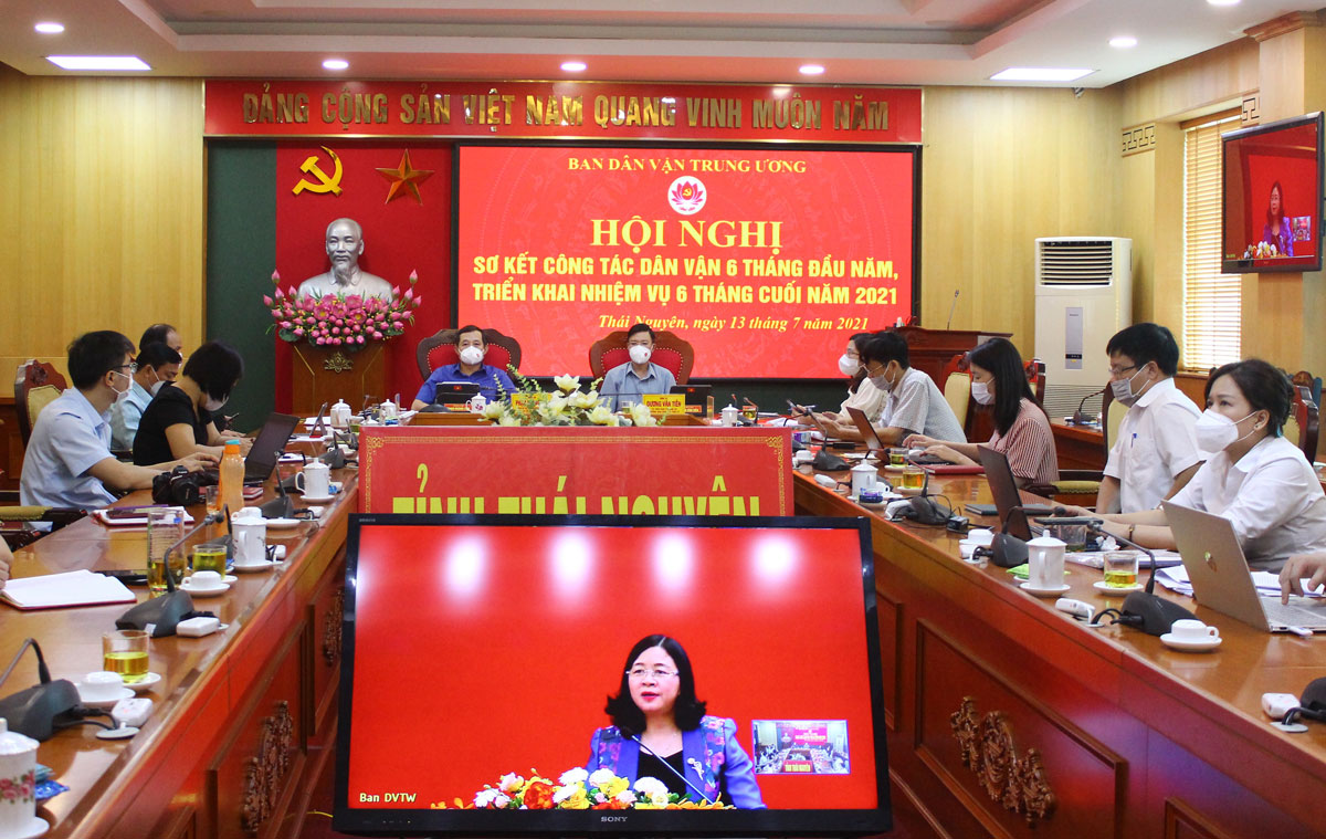 Ngày 13-7, Ban Dân vận Trung ương đã tổ chức Hội nghị trực tuyến toàn quốc sơ kết công tác dân vận 6 tháng đầu năm, triển khai nhiệm vụ 6 tháng cuối năm 2021. Chủ trì Hội nghị có đồng chí Bùi Thị Minh Hoài, Bí thư Trung ương Đảng, Trưởng Ban Dân vận Trung ương và các đồng chí Phó Trưởng Ban Dân vận Trung ương. Dự tại điểm cầu tỉnh Thái Nguyên có các đồng chí: Phạm Hoàng Sơn, Phó Bí thư Thường trực Tỉnh ủy, Chủ tịch HĐND tỉnh; Dương Văn Tiến, Ủy viên Ban Thường vụ, Trưởng Ban Dân vận Tỉnh ủy.