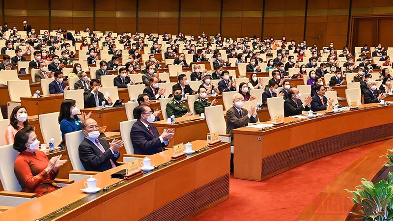 Về công tác lập pháp, Chủ tịch Quốc hội cho biết Quốc hội đã biểu quyết thông qua với sự nhất trí rất cao 2 dự án luật, cho ý kiến 5 dự án luật, ban hành 12 nghị quyết, trong đó có 11 nghị quyết chuyên đề và nghị quyết chung của Kỳ họp, nhằm kịp thời giải quyết những vấn đề cấp bách trước mắt, đồng thời, quyết định những vấn đề quan trọng có tính chiến lược, dài hạn; tiếp tục góp phần quan trọng thể chế hóa, cụ thể hóa Nghị quyết Đại hội lần thứ XIII của Đảng, Hiến pháp năm 2013; bảo đảm thực hiện các cam kết quốc tế và sự tương thích của hệ thống pháp luật với các điều ước quốc tế mà Việt Nam tham gia.