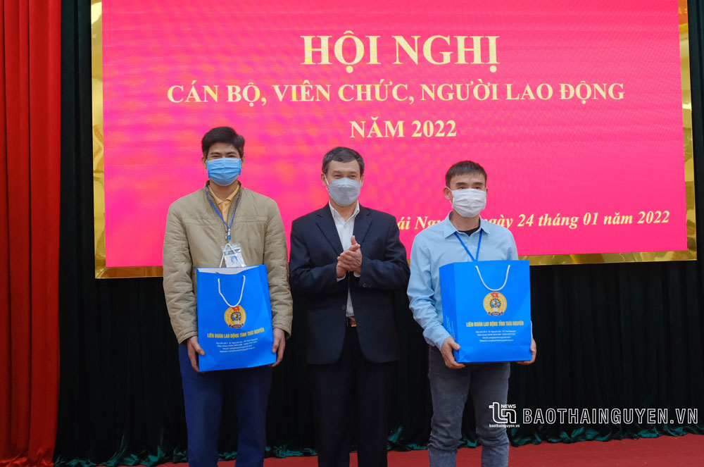 Đồng chí Nguyễn Duy Tuấn, Chủ tịch Công đoàn viên chức tỉnh tặng quà cho 2 người lao động của Nhà in Báo Thái Nguyên.
