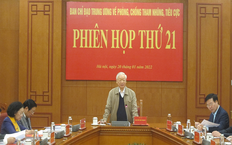 Ngay 20-1, tại Trụ sở Trung ương Đảng, Ban Chỉ đạo Trung ương về phòng, chống tham nhũng, tiêu cực (Ban Chỉ đạo) họp phiên thứ 21 để đánh giá công tác năm 2021, cho ý kiến về chương trình công tác năm 2022 của Ban Chỉ đạo. Tổng Bí thư Nguyễn Phú Trọng, Trưởng Ban Chỉ đạo, chủ trì phiên họp.