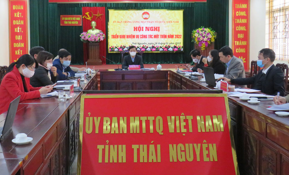 Ngày 18-1, đồng chí Đỗ Văn Chiến, Bí thư Trung ương Đảng, Chủ tịch Ủy ban Trung ương MTTQ Việt Nam chủ trì Hội nghị trực tuyến triển khai nhiệm vụ công tác Mặt trận năm 2022. Dự tại điểm cầu Uỷ ban MTTQ tỉnh Thái Nguyên có các đồng chí trong Ban thường trực Ủy ban MTTQ tỉnh; lãnh đạo các tổ chức đoàn thể, chính trị - xã hội của tỉnh (ảnh).