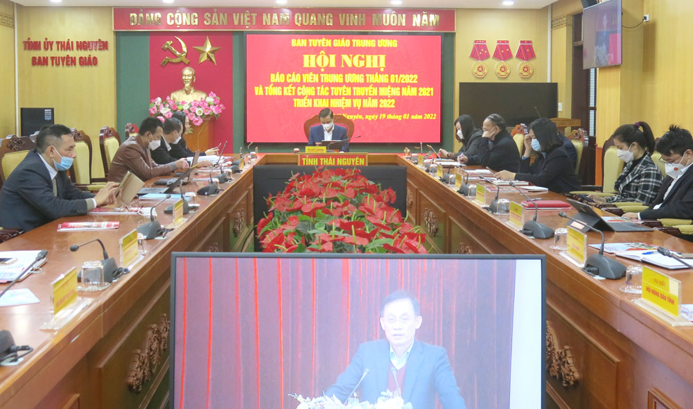 Ngày 19-1, Ban Tuyên giáo Trung ương tổ chức Hội nghị trực tuyến Báo cáo viên Trung ương tháng 1-2022 và tổng kết công tác tuyên truyền miệng năm 2021, triển khai nhiệm vụ năm 2022. Đồng chí Phan Xuân Thủy, Phó Trưởng Ban Tuyên giáo Trung ương chủ trì Hội nghị. Dự tại điểm cầu Thái Nguyên có đồng chí Vũ Duy Hoàng, Ủy viên Ban Thường vụ, Trưởng Ban Tuyên giáo Tỉnh ủy (ảnh).