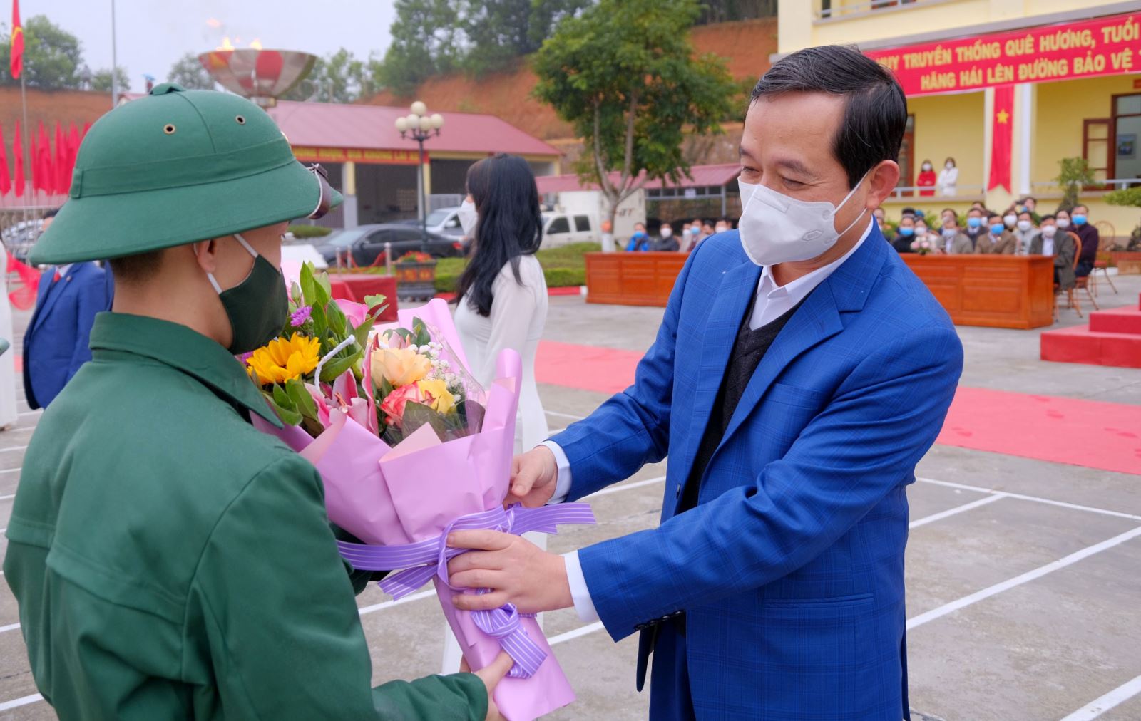 Đồng chí Phạm Thái Hanh tặng hoa, động viên tân binh lên đường nhập ngũ.