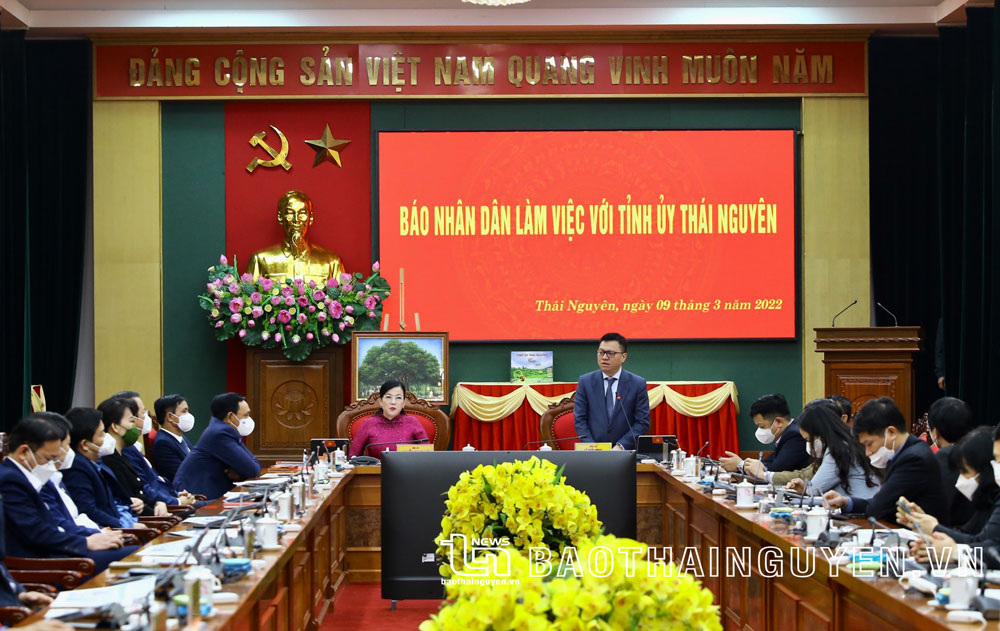 Đồng chí Bí thư Tỉnh ủy cho biết, Thái Nguyên luôn đồng hành, gắn bó với các cơ quan báo chí và được các cơ quan báo chí, trong đó có Báo Nhân Dân quan tâm thông tin, tuyên truyền toàn diện. Thay mặt lãnh đạo tỉnh, đồng chí trân trọng cảm ơn sự quan tâm của Báo Nhân Dân với tỉnh.
