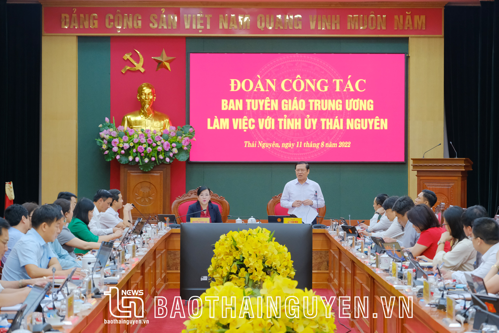Phát biểu kết luận buổi làm việc, đồng chí Phó Trưởng Ban Thường trực Ban Tuyên giáo Trung ương đã ghi nhận, đánh giá cao những nỗ lực lớn, quyết tâm cao và hành động quyết liệt của Đảng bộ tỉnh Thái Nguyên trong việc cụ thể hoá mục tiêu nghị quyết đại hội Đảng các cấp. Kết quả nổi bật trong thời gian qua đã góp phần củng cố, tăng cường niềm tin, tạo động lực phấn đấu để Thái Nguyên thực hiện khát vọng của mình.