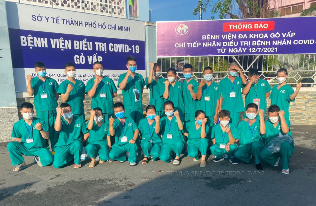 Thời điểm này, mỗi ngày, số người mắc COVID-19 mới trong cộng đồng tại T.P Hồ Chí Minh lên tới 4 con số. Bởi vậy, tại Bệnh viện Đa khoa Gò Vấp, số bênh nhân tăng nhanh, trong đó có không ít bệnh nhân là người cao tuổi, sức đề kháng yếu, có các bệnh lý nền… lâm vào tình trạng nguy kịch. Phải làm việc trong môi trường “đậm đặc” vi-rút SARS-CoV-2 như thế, nhưng những chiến sĩ áo trắng của Bệnh viện Trung ương Thái Nguyên không hề lo lắng cho sự an nguy của bản thân.