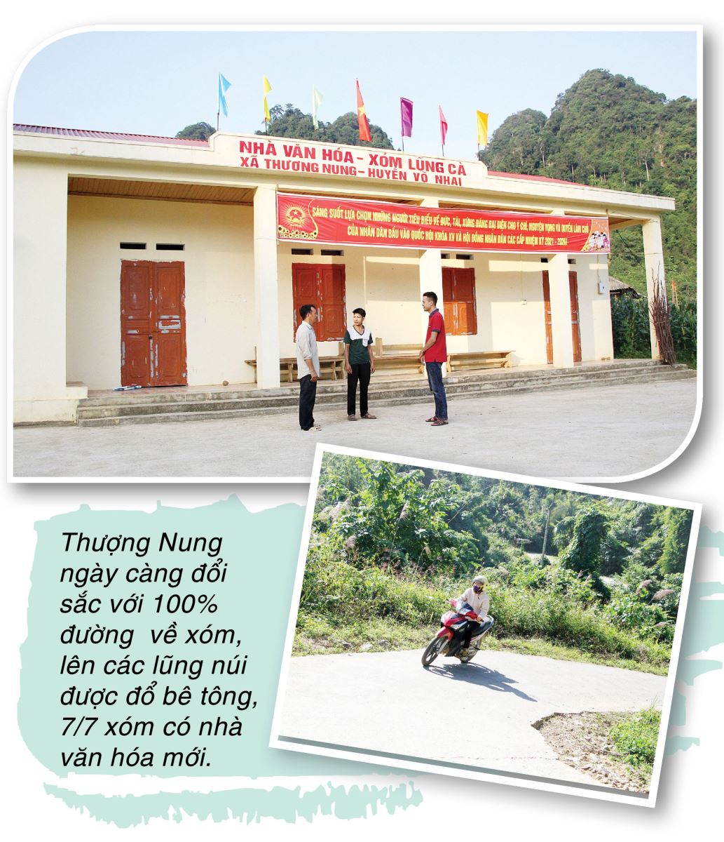 Trong trí nhớ của tôi, khoảng 7-8 năm trước, đường lên Thượng Nung, đặc biệt là các xóm Lũng Luông, Lũng Cà rất khó khăn, cheo leo với những dốc đá gập ghềnh. Ruộng vườn của bà con cằn cỗi, lơ thơ cây bụi khi thiếu sự chăm bẵm của con người cộng với khí hậu khắc nghiệt. Xã có địa hình phức tạp, bị chia cắt bởi nhiều đồi núi, sông, suối. Nhiều khu vực chưa có điện lưới quốc gia... Còn hôm nay, đường vào toàn bộ các xóm, dù ở những nơi sâu xa, nhiều dốc dựng đứng cũng đã được đổ bê tông. Những con đường uốn lượn men theo sườn núi. Hưởng ứng phong trào xây dựng nhà văn hoá xóm theo phương châm “Nhà nước và Nhân dân cùng làm”, người dân đã nhiệt tình tham gia đối ứng. Đến nay, nhà văn hoá của 7/7 xóm đã được xây dựng khang trang, sạch đẹp theo chuẩn nông thôn mới. Trên mỗi khu vườn, cánh đồng, sườn núi đã xuất hiện những mô hình kinh tế mới cho hiệu quả cao. Thượng Nung cũng là xã đầu tiên trong khu vực 6 xã phía Bắc của huyện Võ Nhai triển khai mô hình “Camera giám sát an ninh.