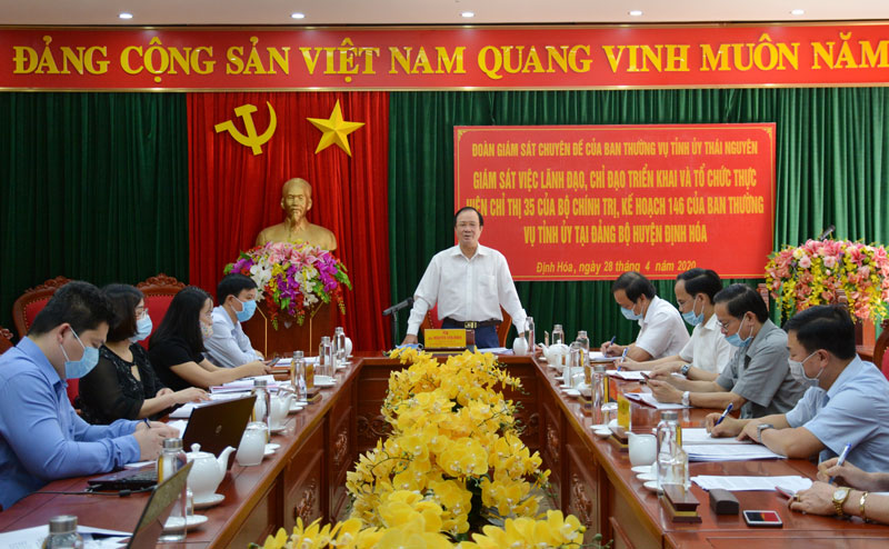 Chiều 28-4, đồng chí Nguyễn Văn Khoa, Ủy viên Ban Thường vụ, Chủ nhiệm Ủy ban kiểm tra Tỉnh ủy đã dẫn đầu Đoàn công tác của Ban Thường vụ Tỉnh ủy thực hiện giám sát việc lãnh đạo, chỉ đạo triển khai thực hiện Chỉ thị số 35-CT/TW ngày 30/5/2019 của Bộ Chính trị; Kế hoạch số 146-KH/TU ngày 21/6/2019 của Ban Thường vụ Tỉnh ủy và công tác chuẩn bị, tổ chức đại hội đảng các cấp tại Đảng bộ huyện Định Hóa (ảnh).
