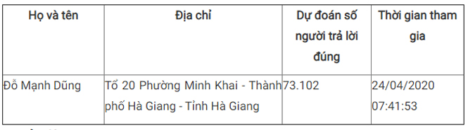 Trong tuần thi thứ 5, có 293.592 người dự thi với 577.980 lượt thi, 73.102 người trả lời đúng cả 10 câu hỏi. Bạn Đỗ Mạnh Dũng - Phường Minh Khai, Thành phố Hà Giang, tỉnh Hà Giang trả lời đúng 10/10 câu hỏi tuần, dự đoán chính xác số người trả lời đúng là 73.102 người, đoạt giải Nhất tuần 5 của Cuộc thi.