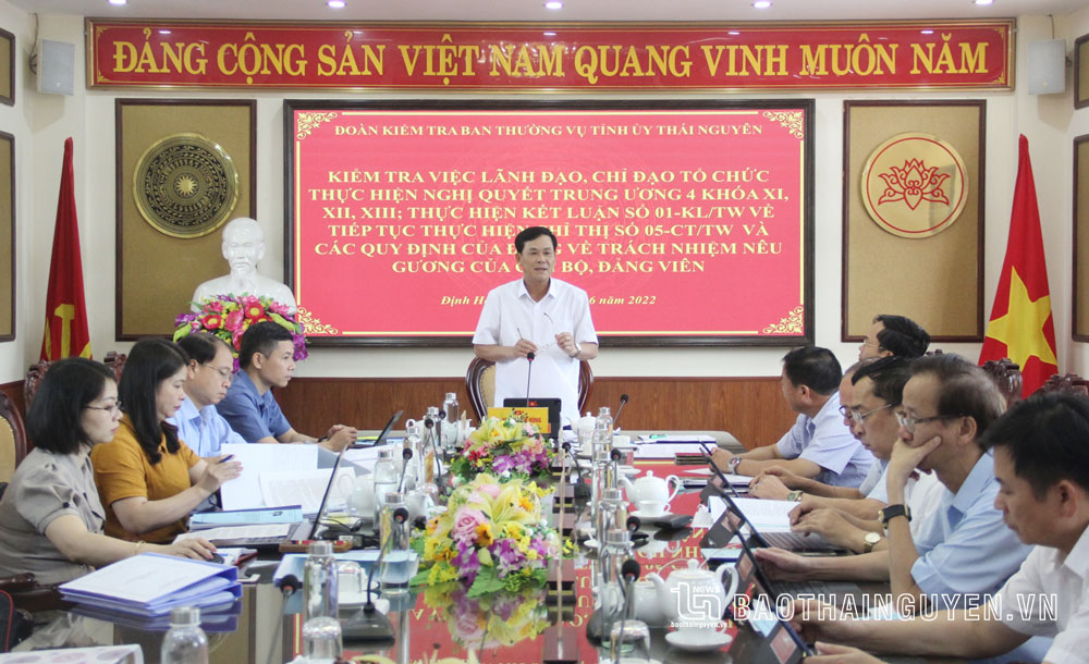 Đó là một trong những ý kiến của đồng chí Hoàng Văn Hùng, Ủy viên Ban Thường vụ, Chủ nhiệm Ủy ban Kiểm tra Tỉnh ủy – Trưởng Đoàn Kiểm tra của Ban Thường vụ Tỉnh ủy đối với Huyện ủy Định Hóa, tại buổi kiểm tra việc lãnh đạo, chỉ đạo tổ chức thực hiện Nghị quyết Trung ương 4 khóa XI, XII, XIII; Kết luận số 21-KL/TW gắn thực hiện Kết luận số 01-KL/TW về tiếp tục thực hiện Chỉ thị số 05-CT/TW của Bộ Chính trị “Về đẩy mạnh học tập và làm theo tư tưởng, đạo đức, phong cách Hồ Chí Minh” và các quy định của Đảng về trách nhiệm nêu gương của cán bộ, đảng viên, ngày 29-6 - (ảnh).