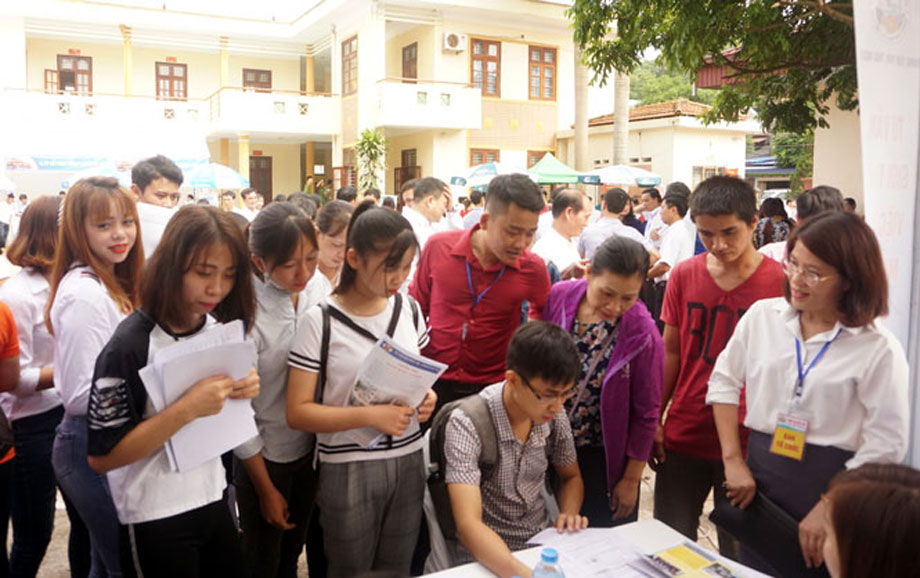 Nhiều sinh viên mới ra trường được tạo điều kiện tham gia các phiên giao dịch việc làm để kết nối với các doanh nghiệp có nhu cầu tuyển dụng lao động. Trong ảnh: Sinh viên tham gia tìm kiếm thông tin và cơ hội việc làm tại Ngày hội việc làm huyện Đồng Hỷ. Ảnh:T.L