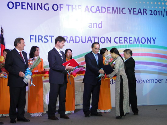 Tại buổi lễ khai giảng, nguyên Thủ tướng CHLB Đức Gerhard Schroder đã đánh giá rất cao những đổi thay không chỉ về kinh tế mà còn về giáo dục của Việt Nam. Ông tin rằng với những chính sách mở mà Việt Nam đang theo đuổi, hướng đi đúng đắn trong việc xây dựng mô hình giáo dục ĐH theo hướng chuẩn quốc tế và nghiêng nhiều về công tác nghiên cứu… trong tương lai gần Việt Nam sẽ có được nguồn nhân lực chất lượng, Việt Nam hoàn toàn có khả năng lẫn năng lực cạnh tranh với các nước trong khu vực về chất lượng giáo dục.