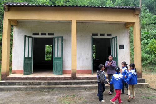 Trở lại lớp học được xây dựng cheo leo trên quả đồi trung tâm của bản, chúng tôi được chứng kiến một buổi học đúng “bản sắc vùng cao”. Đây cũng là lớp học duy nhất của bản. Đó là lớp học ghép 2 trình độ (lớp 1 và lớp 4). Gọi là lớp học, nhưng cả lớp chỉ có 5 học sinh (4 học sinh lớp 1 và 1 học sinh lớp 4). Trong căn phòng rộng hơn 10m2, đầu lớp và cuối lớp được kê 2 chiếc bảng. Cô giáo Trương Thị Huyên giảng hết một phần bài của lớp 1 lại xuống giảng tiếp bài cho học sinh lớp 4. Cứ như vậy, trong một buổi sáng, cô phải đi lại nhiều lần, giảng giải cặn kẽ để các em hiểu bài.