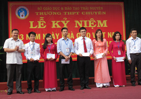 * Trường THPT Chuyên Thái Nguyên đã tổ chức Lễ kỷ niệm 33 năm ngày Nhà giáo Việt Nam (20-11). Dự buổi Lễ có lãnh đạo Ban Tuyên giáo Tỉnh ủy, đại diện lãnh đạo một số sở,ban, ngành, địa phương trong tỉnh cùng các bậc phụ huynh và trên 1.000 cán bộ, giáo viên, học sinh toàn trường.