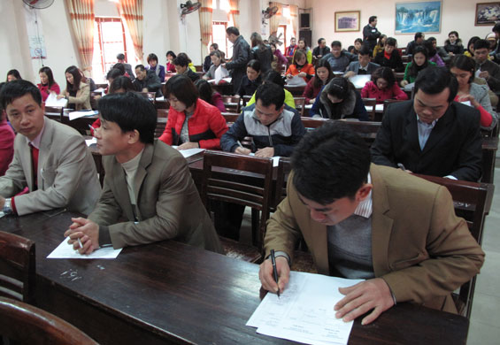 Ngay sau phần khai mạc Hội thi, các giáo viên bước vào phần thi làm bài lý thuyết (ảnh). Những giáo viên nào đạt 8 điểm lý thuyết sẽ tiếp tục thi giảng 2 tiết. Lịch thi giảng tổ chức từ ngày 9 đến 14-3-2016 tại các trường THCS: Nguyễn Du, Nha Trang, Quang Trung T.P Thái Nguyên.