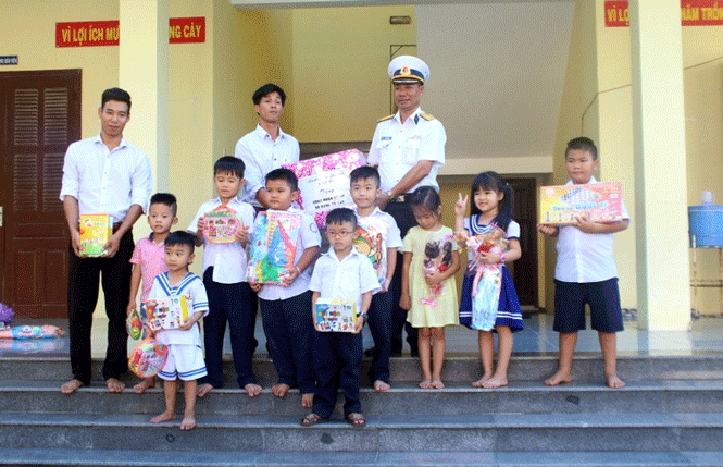 Giáo viên và học sinh ở đảo Song Tử Tây nhận quà Tết từ đất liền.